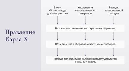Закон «О миллиарде для эмигрантов» предусматривал компенсации за потерянное в годы революции имущество. Была распущена национальная гвардия Парижа. Действия Карла X вели к политическому кризису.