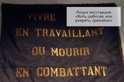 Они объяснили это усилившейся конкуренцией. В ноябре этого же года в городе началось восстание. Лозунгом восставших стали слова: «Жить, работая, или умереть сражаясь!»