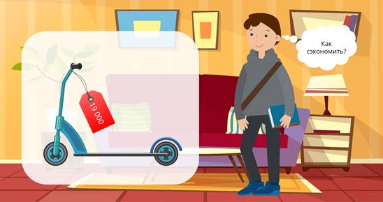 Это Кирилл. Он хочет купить в конце учебного года электросамокат, который стоит 19 тысяч рублей. Кирилл решил купить электросамокат сам, откладывая часть карманных денег, которые ему выдают родители. В первую очередь подумаем, как можно сэкономить.