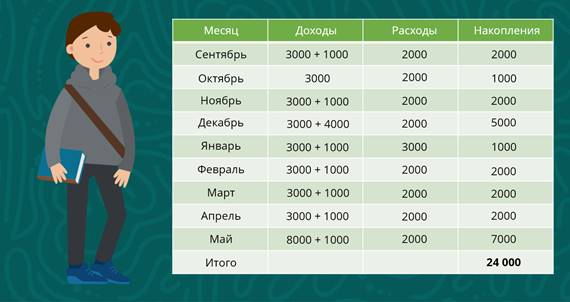 Кирилл составил таблицу. Получился его личный финансовый план: учёт доходов и расходов, который поможет достичь финансовой цели. Каждый месяц учебного года Кирилл готов откладывать по тысяче рублей из тех трёх тысяч, которые получает на карманные расходы. А ещё у него 5 мая день рождения, на который бабушки и дедушки подарят ещё примерно 5 тысяч рублей.