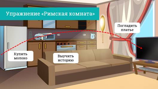 Следующее упражнение связано с методом, известным как «римская комната» или «чертоги памяти». Представьте свою квартиру или комнату. Выберите там несколько опорных образов (телевизор, настольная лампа, холодильник и так далее) и, перемещаясь по часовой стрелке, проложите между ними маршрут.