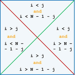 Рассмотрим, как делит матрицу главная диагональ. Она делит матрицу на 3 части. Элементы, которые находятся на диагонали, нас не интересуют. В элементах, которые выше главной диагонали, то есть в верхнем и правом секторах, номер строки меньше номера столбца, в элементах ниже её, то есть в левом и нижнем секторах, наоборот, номер строки больше номера столбца. Также матрицу делит побочная диагональ. В элементах, которые выше побочной диагонали, номер строки всегда меньше, чем разность размерности матрицы, уменьшенной на единицу, и номера столбца. Ниже побочной диагонали, наоборот, номер строки больше разности размерности матрицы, уменьшенной на единицу, и номера столбца. Зная, что верхний сектор квадратной матрицы находится выше и главной, и побочной диагоналей, мы можем соединить два соответствующих условия союзом И, получив таким образом условие принадлежности элемента матрицы к верхнему сектору. Аналогично выводятся условия принадлежности элемента матрицы и к остальным секторам.