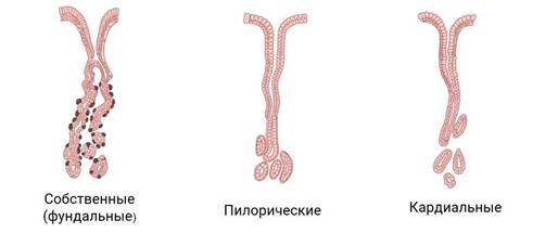 Различают три группы желёз: преобладают собственные (фундальные), пилорические и кардиальные.