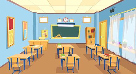 In der Klasse stehen viele Tische und Stühle. Links an der Tür steht ein Schrank. Im Schrank sind viele Bücher und Hefte. Links stehen noch ein Tisch und ein Stuhl. Hier sitzt unser Lehrer.