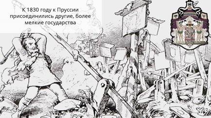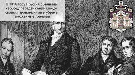 В 1818 году там была объявлена свобода передвижения между всеми провинциями и убраны таможенные границы. Теперь при перевозке товаров не было необходимости платить высокие пошлины. К 1830 году к Пруссии присоединились более мелкие государства Германии.