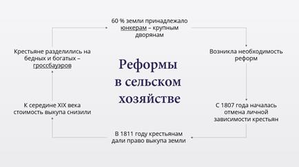 События революции во Франции показали необходимость реформ в аграрном хозяйстве. С 1807 года началась постепенная отмена личной зависимости крестьян. Им дали право распоряжаться имуществом, но при этом сохранялись феодальные повинности. В 1811 году крестьянам предоставили право выкупа земель. Но цена была очень высокой. В середине XIX века выплаты за землю были снижены. Появилось разделение крестьян на богатых – гроссба̀уэров, и бедных, которые были вынуждены наниматься на работу батраками.