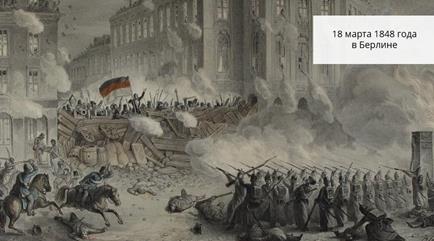 Рассмотрим Берлинское восстание. С начала марта 1848 года на улицах города устраивали митинги и демонстрации, происходили столкновения с полицией.