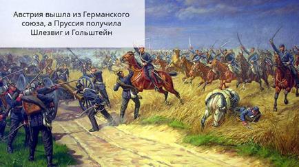 Однако главной задачей Бисмарка было ослабить Австрию. Он считал, что Германия «слишком тесна» для двух таких сильных государств. Бисмарк предложил исключить Австрию из Германского союза. А в июне 1866 года войска Пруссии вторглись в Австрию. Уже через два месяца был подписан мирный договор, по которому Австрия выходила из Германского союза, Пруссия получала Шлезвиг и Гольштейн, а союзник Пруссии Италия получала Венецию.