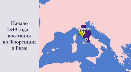 В начале 1849 года начались восстания во Флоренции и Риме. Герцог и Папа были вынуждены бежать. Власть перешла в руки восставших. Таким образом в Италии появились три республики – Римская, Флорентийская и Венецианская (охраняемая пьемонтскими войсками).