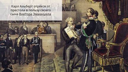 Не сдавался только Пьемонт. Его король Виктор Эммануил II пользовался у народа популярностью. Он стремился продолжить дело отца в борьбе с австрийцами. Немалую роль в усилении Пьемонта сыграла деятельность премьер-министра Камѝлло Бѐнсо ди Каву̀ра, который уделял много внимания развитию экономики.