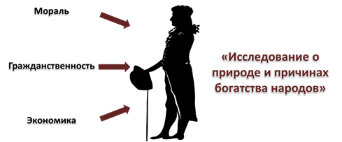 Он предпринял попытку взглянуть на человека с разных позиций: морали, гражданственности, экономики. Благодаря этому ему удалось написать «Исследование о природе и причинах богатства народов».