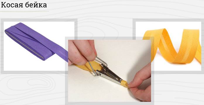 Как правило, в продаже можно встретить уже готовые бейки разного цвета и ширины. Они заранее приутюжены вдвое. Но с помощью специального приспособления, такие же бейки можно изготовить дома самостоятельно.