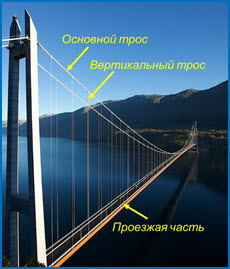 К основным тросам крепят вертикальные, на которые подвешивают проезжую часть моста.