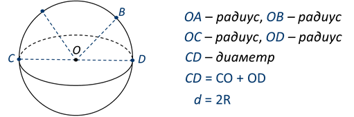 Отрезок, соединяющий две точки сферы и проходящий через центр шара, называется диаметром шара.