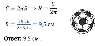 Чтобы измерить радиус футбольного мяча, Никита обмотал мяч по центру ниткой. Затем измерил её. Длина нитки равна 59,66 см. Определите радиус футбольного мяча.