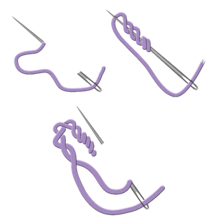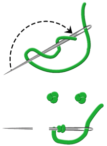 Рабочую нить закрепляют и выводят на лицевую сторону ткани. Берут в левую руку и натягивают участок длиной один полтора сантиметра. На нить кладут кончик иглы и обматывают его один три раза. После этого, иглу надо вколоть в ткань на небольшом расстоянии от того места, где нитка вышла на поверхность. Важно добиться того, чтобы те навивки, которые мы сделали соскользнули по игле и легли на ткань.