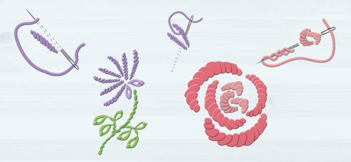 Затем, придерживая навитый участок большим и указательным пальцами левой руки, нужно осторожно протянуть через него иглу. Вколоть ее в точку второго прокола и вытянуть нитку на изнаночную сторону. У нас получился первый жгутик цветка.
