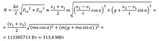 Задача 2. Истребитель, под действием постоянной силы тяги, направленной под углом 45° к горизонту, разгоняется от 150 м/с до 570 м/с. При этом, вертикальная и горизонтальная скорость истребителя увеличиваются на одинаковое значение в каждый момент времени. Масса истребителя равна 20 т. Если истребитель разгонялся в течение одной минуты, то какова мощность его двигателя?