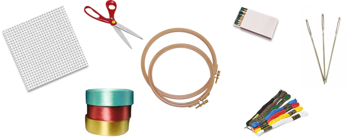 Итак, для того чтобы научиться работать в этой технике понадобятся обычные пяльцы, тканевая основа, иглы, ленты, нитки, ножницы, зажигалка или спички.