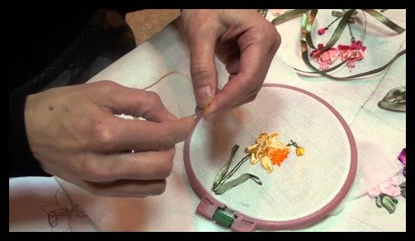 Мы с вами рассмотрели, как выполняются основные швы в технике вышивания лентами. А теперь давайте посмотрим, как можно сделать цветок из ленты в сборку.