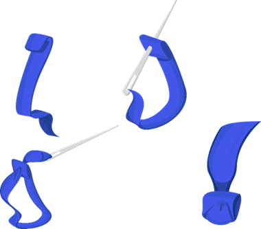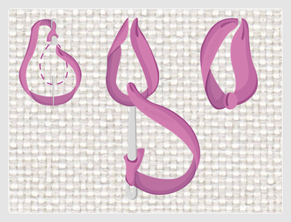 Следующей рассмотрим выполнение петли с прикрепом. Итак, выведем иглу с лентой на лицевую сторону. Затем вплотную к этой же точке будем уводить иглу на изнаночную сторону. После этого выведем иглу с лентой в вершине будущей петли. Затем подтянем ленту, до образования петли нужной формы. И наконец, уведём иглу на изнаночную сторону, подтягивая ленту.