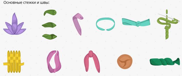 В основе техники вышивания лентами лежат несколько абсолютно простых стежков и швов, комбинации которых позволяют добиваться великолепных результатов. Мы с вами рассмотрим выполнение следующих стежков: прямой стежок, прямой стежок с завитком, изогнутый прямой стежок, ленточный стежок, ленточный стежок-бант, шов «шнурок», шов «сетка», петля с прикрепом, полупетля с прикрепом, французский узелок и шов рококо.