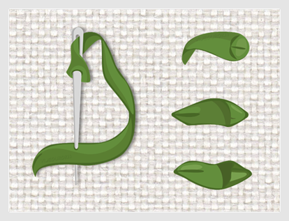 После этого на расстоянии требуемой длины стежка вколем иглу в центр ленточки и протянем её на изнаночную сторону. При этом ленту нужно затягивать постепенно, пока на её конце не сформируется острый уголок с симметричными завитками кромок посередине ленты.
