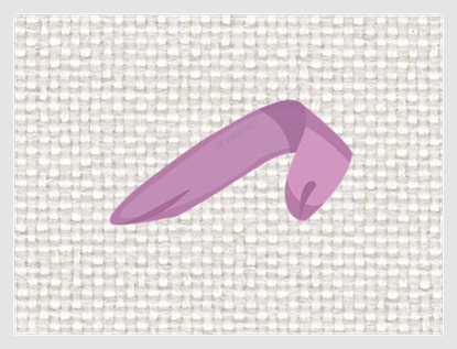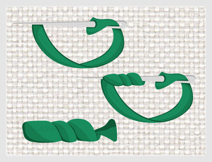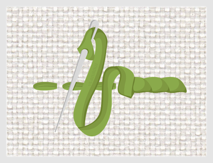 И последним мы рассмотрим выполнение шва рококо. Выведем иглу с лентой на лицевую сторону основы. Затем расположим иглу так, чтобы она оказалась параллельной плоскости основы и обовьём её лентой два–три раза. Важно, чтобы витки не перекрывали друг друга.