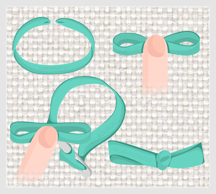 Прежде чем приступить к работе, ленту нужно закрепить на изнаночной стороне основы. Для этого применяют плоский узел.