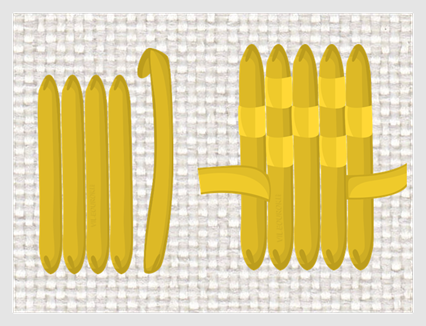 А теперь выполним шов «сетка». Для начала сделаем нужное количество вертикальных прямых стежков, идущих один за другим и равной длины. Затем переплетём эти стежки дополнительной лентой. Такой шов можно использовать для вышивания корзины или плетня.