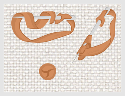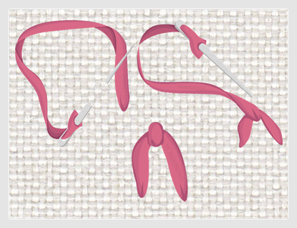 Ещё мы с вами рассмотрим, как выполняют французский узелок. Для этого выведем иглу с лентой на лицевую сторону. Затем обовьём её вокруг иглы два–три раза. После этого выведем иглу на изнаночную сторону в точке, близкой к выходу иглы на лицевую сторону, протянув её через выполненные завитки.