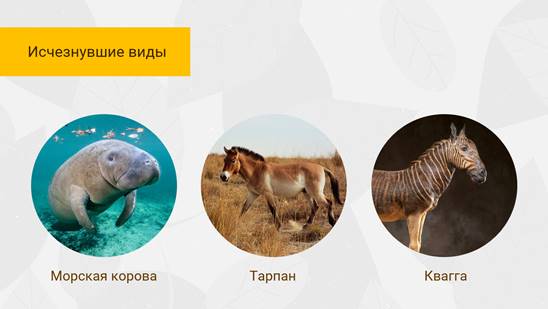Самыми известными из уничтоженных человеком животных стали морская корова, тарпан, квагга, странствующий голубь, дронт, бескрылая гагарка.