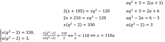Задание седьмое. Три брата, возрасты которых образуют геометрическую прогрессию, делят между собой сумму денег пропорционально своему возрасту. Если бы они это проделали через 3 года, когда самый младший брат окажется вдвое моложе самого старшего, то младший бы получил на 105, а средний на 15 рублей больше, чем сейчас. Сколько лет каждому из братьев?