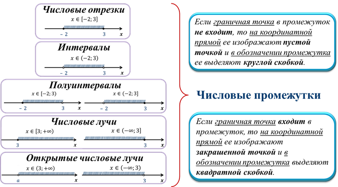 Замечание: Если граничная точка в промежуток не входит, то на координатной прямой её изображают пустой точкой и в обозначении промежутка её выделяют круглой скобкой. Если же граничная точка входит в промежуток, то на координатной прямой её изображают закрашенной точкой и в обозначении промежутка выделяют квадратной скобкой.
