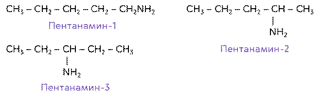 Изомерами по положению аминогруппы будут: пентанамин-1, пентанамин-2, пентан-амин-3.