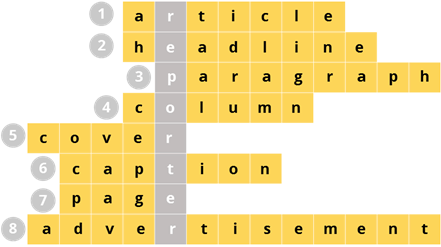Here the most important articles are usually placed. Each newspaper article has a title (called the headline) that is printed in large letters. Headlines are written in a specific abbreviated style. The article consists of paragraphs.