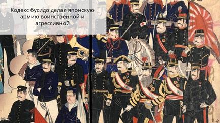 В японской армии продолжал действовать бусидо̀ – кодекс поведения для самураев. Это делало её очень воинственной и агрессивной.