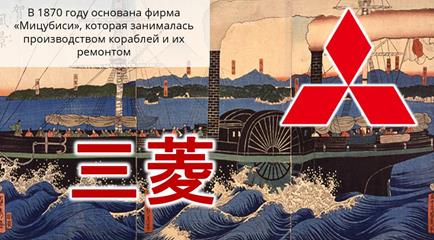 В 1870 году основана фирма «Мицубѝси», которая занималась производством кораблей и их ремонтом. Её название сочетает в себе два иероглифа, которые означают «три» и «водяной каштан», считающийся в Японии ромбовидным алмазом. На логотипе компании – три алмаза.