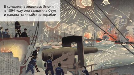 В это же время в конфликт решила вмешаться Япония, под предлогом помощи. В 1894 году японцы захватили Сеул и напали на китайские корабли. Так началась война с Китаем, из которой Япония вышла победительницей.