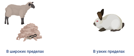 У одних признаков норма реакции очень широка (настриг шерсти с овец). А другие признаки характеризуются узкой нормой реакции (окрас шерсти у кроликов).