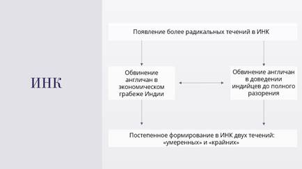 Их представители обвиняли англичан в экономическом грабеже Индии, в доведении индийцев до полного разорения. Постепенно в ИНК сформировались два течения: «умеренные» и «крайние».