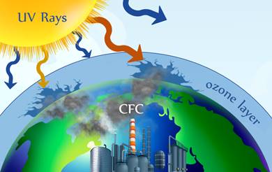 The ozone layer protects the earth from the suns UV Rays. The ozone layer depletion is caused by the pollution of the air with CFCs (chlorofluorocarbons). The hole above the Antarctic is estimated to be about the size of America! This hole enables harmful ultraviolet rays to enter the Earth’s atmosphere.