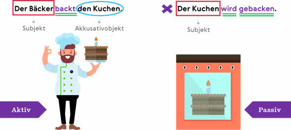 Im ersten Satz handelt das Subjekt, also, „Der Bäcker“ ist aktiv: Er backt den Kuchen.