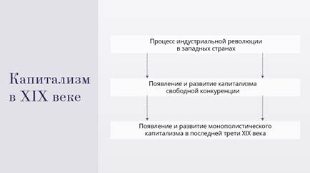 Индустриальная революция породила такое явление, как капитализм свободной конкуренции. В последней трети столетия из него вырос монополистический капитализм (империализм).