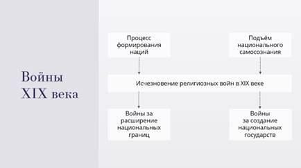 В XIX веке исключением стали религиозные войны. Хотя в Средневековье и в Раннее Новое время они преобладали. Однако процесс формирования наций и подъём национального самосознания вели к войнам иного рода – за расширение национальных границ. За создание национальных государств.