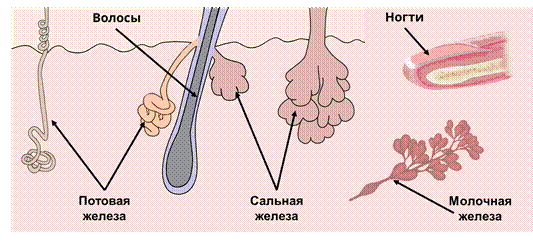 К производным структурам кожи относят: волосы, ногти, молочные, сальные и потовые железы.