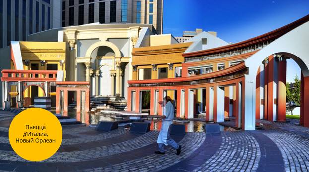 С США построено «Пьяцца д’Италия». Оно сочетает в себе элементы Античности и итальянского Возрождения. Колонны здания покрыты металлическими листами.
