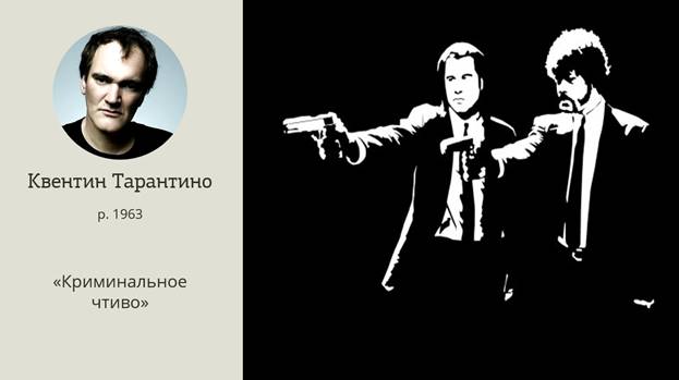В эпоху постмодернизма в криминальных фильмах пропадает моральная оценка героев, зачастую они предстают в комичном или пародийном образе. Ярким примером является фильм Квентина Тарантино «Криминальное чтиво», вышедший в 1994 году. Его особенностью стало то, что сюжет разбит на части, показанные не в хронологическом порядке. Тарантино использовал этот приём и ранее. Как и многие фильмы этого периода, «Криминальное чтиво» наполнено отсылками к другим кинолентам.