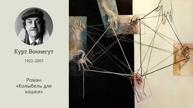 Курт Воннегут сочетал в своих произведениях чёрный юмор, научную фантастику и сатиру. Роман «Колыбель для кошки» поднимает вопрос об ответственности учёных за свои изобретения. В книге рассказывается история Феликса Хонникера, создавшего опаснейшее вещество «лёд-девять». Оно может вызвать гибель жизни на Земле.