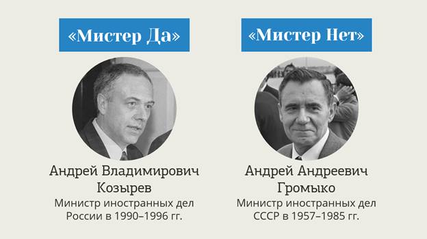 Министра иностранных дел России Андрея Владимировича Козырева за постоянное согласие с условиями западных коллег прозвали «Мистер Да»,